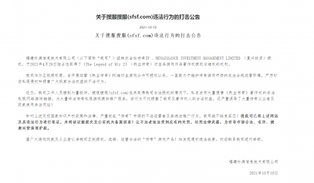 202110-13关于搜服搜服(sfsf.com)违法行为的打击公告 好体育官方网站登录信息技术有限公司(以下简称“我司”)经株式会社传奇IP 、RENAISSANCE...