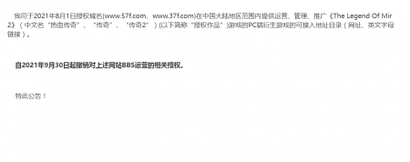 202111-15我司于2021年8月1日授权域名(www.57f.com、www.37f.com)在中国大陆地区范围内提供运营、...
